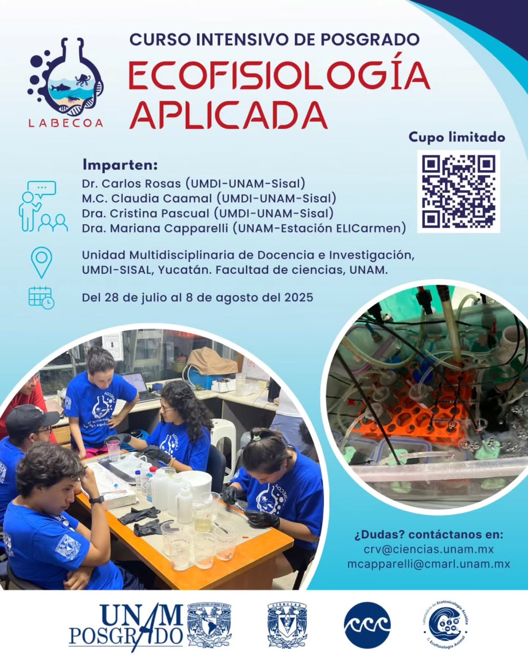 Acompáñanos en esta experiencia académica única, donde aprenderás a evaluar los efectos de contaminantes y cambio climático en organismos acuáticos mediante herramientas experimentales y fisiológicas.